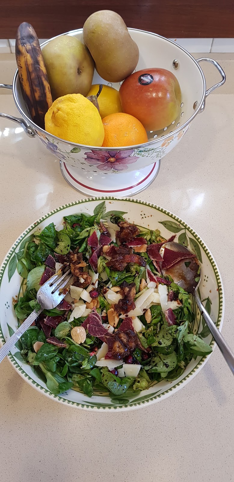 - Esta ensalada es muy rica en fibra, vitaminas A, C, E, carotenos, retinol, polifenoles (granada) (antioxidantes naturales), ácido fólico, potasio, calcio, yodo, fósforo y ácidos grasos omega 6. Contiene proteína animal y vegetal de alta calidad, ácidos grasos omega 3, otras vitaminas (D, K, grupo B completo y minerales (magnesio, selenio, sodio, hierro).