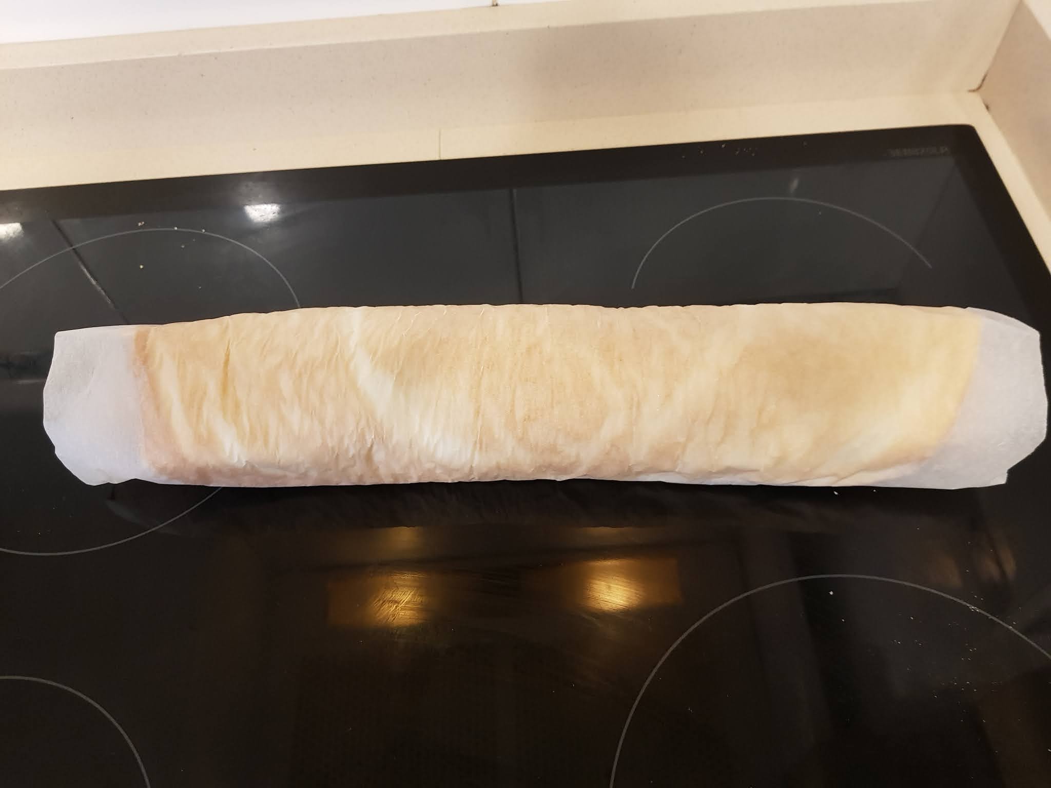 Verter la mezcla obtenida en la bandeja de horno preparada y extenderla por toda la superficie con la espátula. Hornear durante unos 12 minutos a 180ºC.Precalentar el horno a 180°C. Enrollar el bizcocho en caliente sin quitar el papel de cocina y dejarlo enfriar enrollado.